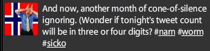 And of course global ignore really isn't possible. His minions report back to him and if he follows hashtags - I'm sure he does - then he sees my stuff. What the ignore business is about is that he would really prefer not to answer back when called on elementary facts.